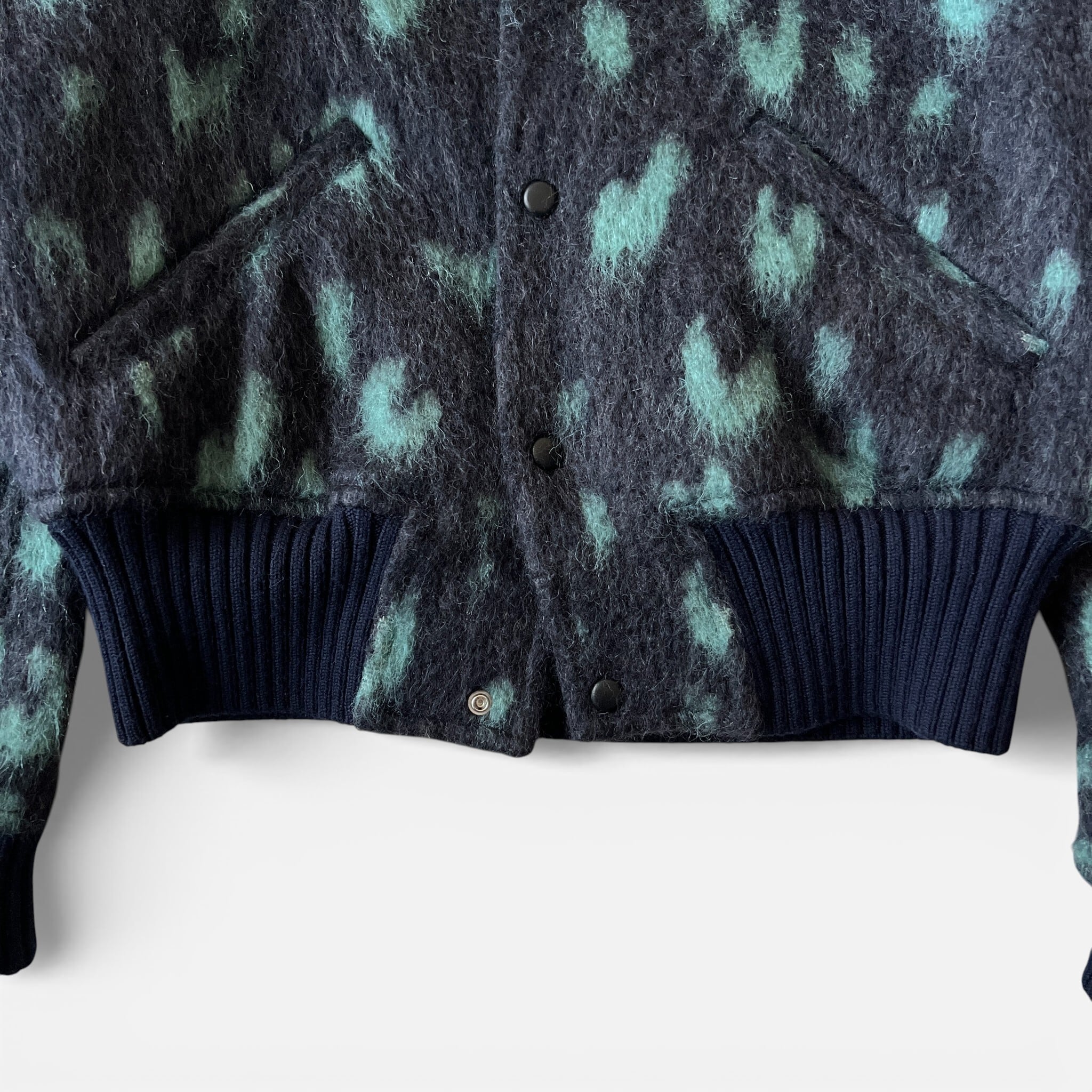 モヘア混の毛足の長いシャギーな質感が、このエッジの効いた柄を程よく上品な表情に見せてくれています。